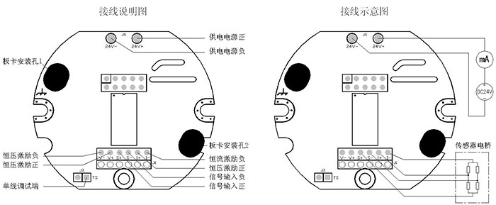 圖中J3為校準(zhǔn)通信單線接口。 J1為傳感器接線端子,提供恒壓恒流激勵。 24V+和24V-為變送器兩線制接線口,提供DC24V電源,輸出4~20mA電流信號。 |