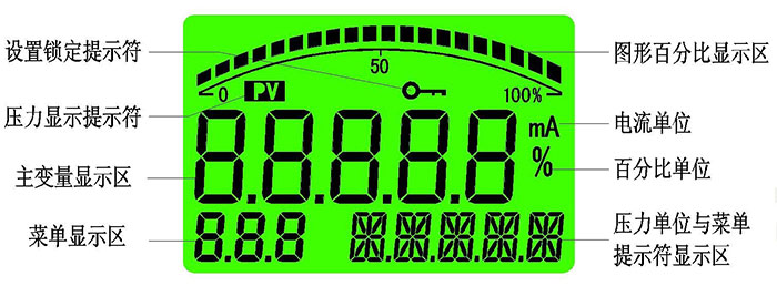 4.2.2調(diào)滿鍵“S” ?測量模式下短按為顯示模式修改功能。 ?測量模式下長按5秒為進(jìn)入調(diào)滿功能(即標(biāo)定變送器滿點(diǎn))。 ?設(shè)置模式下為設(shè)置參數(shù)加一功能,長按時連續(xù)移位加一。 4.2.3調(diào)零鍵“Z” ?測量模式下短按為顯示模式修改功能。 ?測量模式下長按5秒為進(jìn)入調(diào)零功能(即標(biāo)定變送器零點(diǎn))。 ?設(shè)置模式下為設(shè)置參數(shù)移位與減一功能,長按時連續(xù)移位或減一。 4.2.4按鍵功能綜述 儀表通過面板的三個按鍵實(shí)現(xiàn)所有的參數(shù)輸入和校準(zhǔn)數(shù)據(jù)的設(shè)置、采集,本儀表的設(shè)置和輸入采取了多種優(yōu)化措施來提高客戶的操作速度: ?儀表的移位鍵和增加鍵具有變速率功能。 ?儀表同時具有移位和增量輸入方法,針對需要大量數(shù)修改的菜單使用移位方式,需要連續(xù)輸入數(shù)據(jù)的菜單采取了增量方式。 ?儀表在設(shè)置狀態(tài)下會停止模擬輸出,所以如果60秒內(nèi)用戶沒有操作儀表,則會自動退出到測量狀態(tài)。 ?儀表在正常退出菜單的時候才會保存所有設(shè)置的參數(shù)。 4.3快捷功能 ?儀表有主變量清零,零點(diǎn)有源遷移,滿點(diǎn)有源遷移三種快捷功能,便于用戶現(xiàn)場的快速設(shè)定。 4.3.1主變量清零 主變量清零即PV清零,是相對大氣壓下的零點(diǎn),不是傳感器量程的零點(diǎn)。將變送器直接置于大氣壓下,長按“M”鍵5秒以上,即可進(jìn)入主變量清零功能,如右圖,菜單區(qū)顯示“P=0”,通過“S”鍵和“Z”鍵選擇需要進(jìn)行的操作,提示符區(qū)相應(yīng)顯示: