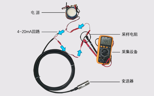 下圖為實際應(yīng)用模擬圖,藍(lán)色箭頭所指為4~20mA電流流向,使用萬用表作為采集設(shè)備,采樣電阻250歐,零點電流4mA,采集到的電壓約0.997V(0.004mA×250歐=1V)。